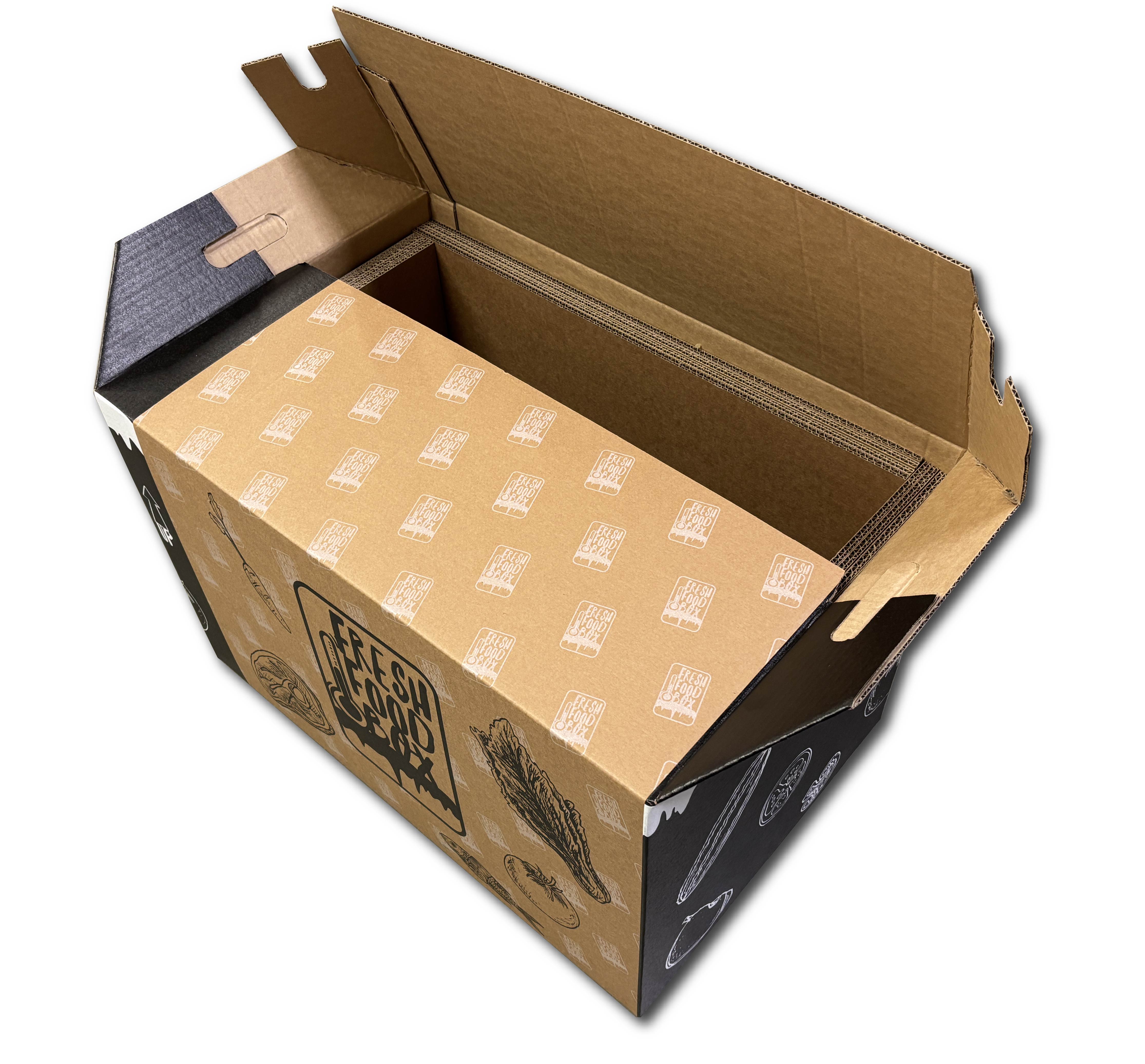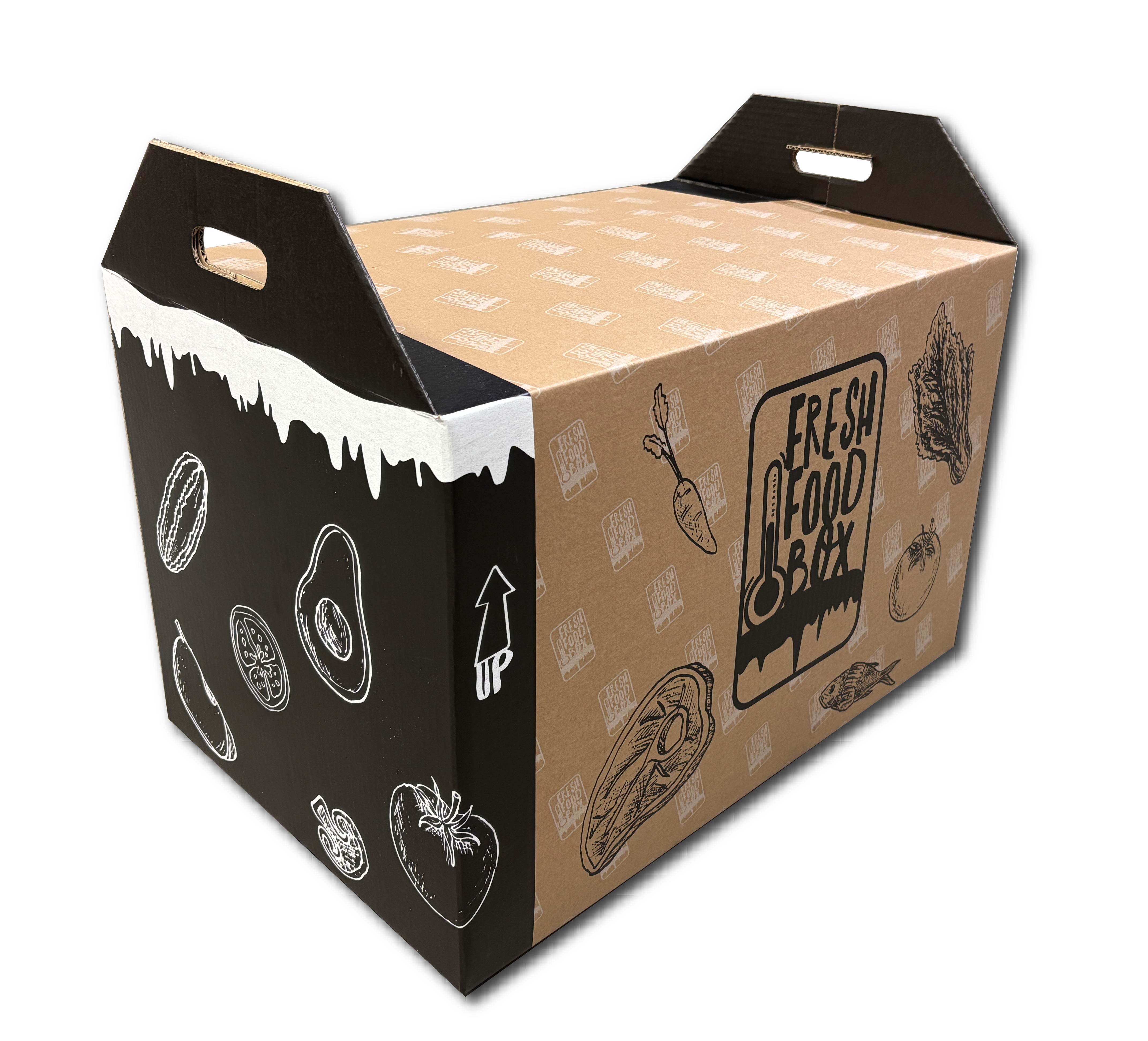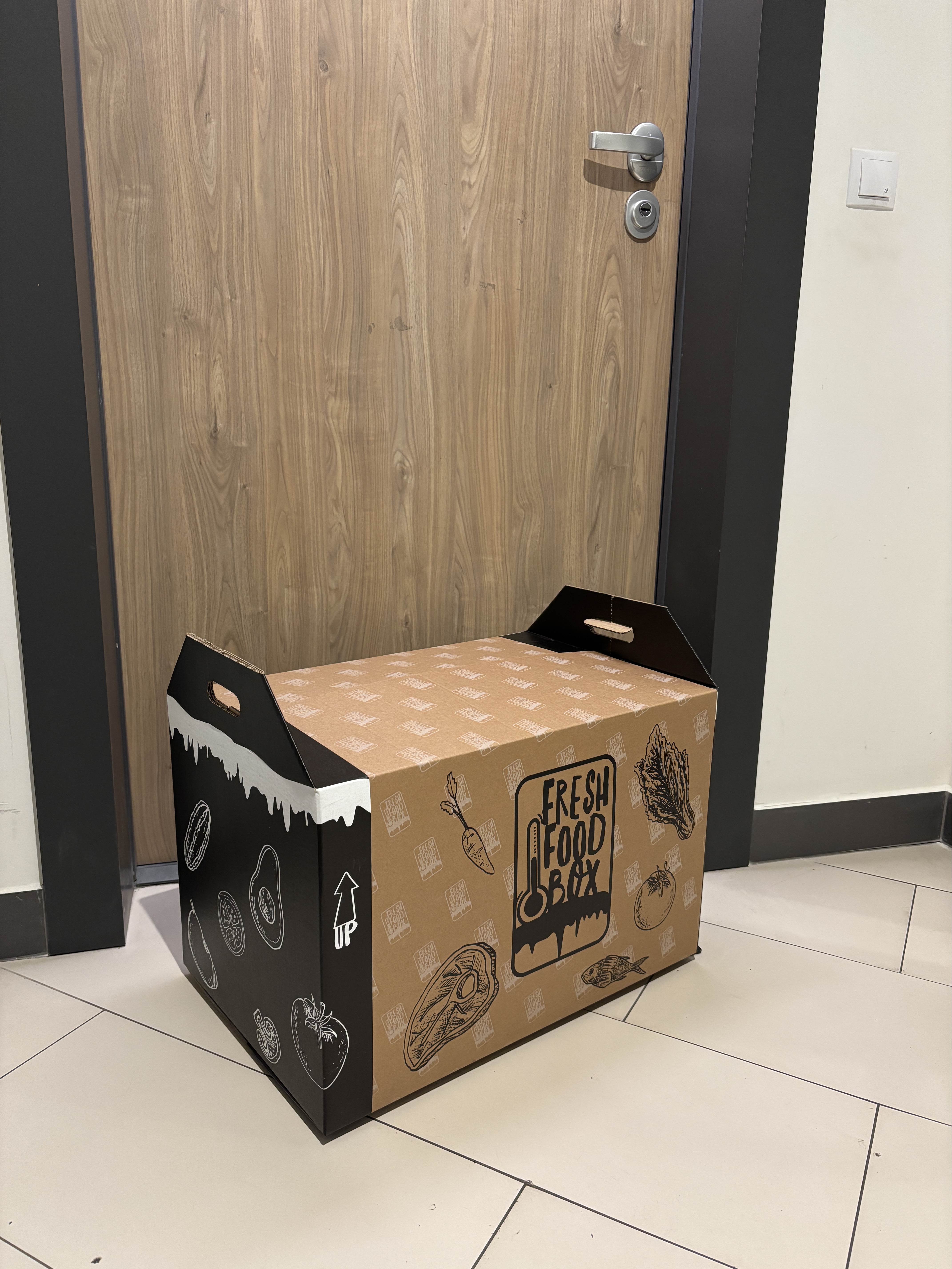 FreshFood BOX is Eco-Friendly Cardboard Packaging for Fresh Food Transport. Our innovative packaging is designed for online stores that deliver fresh food. With thick cardboard inserts and special cooling elements, it effectively maintains a low temperature, protecting products from spoilage. Its airtight construction shields the contents from external factors, while ergonomic transport handles make carrying easy.